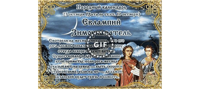 23 октября (Дата по ст. ст. 10 октября) Евлампий Зимоуказатель. Смотрели на месяц: считалось, что его рога должны показывать в ту сторону, откуда вскоре подуют ветры. Существовало и другое толкование этой приметы: если рога месяца указывают на север - быть скорой зиме, если на юг - до самой Казанской будет грязь и слякоть.