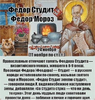 Федор Студит. Федор Мороз 24 ноября (11 ноября по ст. ст.) Православные отмечают память Феодора Студита византийского монаха, жившего в 8-9 веках. Прозвище Федора (Феодора) — Студит — в русском народе истолковали по-своему, называя святого еще и Морозом. «Федор Студит землю студит», — говорили люди. И, видя неизбежное наступление зимы, добавляли: «Со Студита стужа — что ни день, тохуже». Этот день мудрые люди советовали провести дома — поближе к печке и горячим щам.