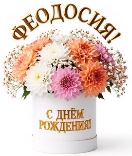Красочный поздравительный цифровой коллаж с пышным букетом георгинов в белой подарочной коробке. Букет состоит из нежных розовых, белых и персиковых цветов, дополненных мелкими соцветиями гипсофилы. Сверху золотыми объемными буквами написано «ФЕОДОСИЯ!», а на коробке расположена золотая надпись «С ДНЁМ РОЖДЕНИЯ!». Изображение выполнено на чистом белом фоне, создавая праздничное и торжественное настроение. Идеально подходит для использования в качестве виртуальной открытки или поздравительного поста для жителей Феодосии.