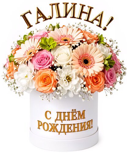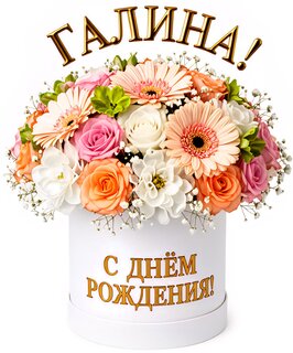 Красивый поздравительный букет в белой подарочной коробке с надписью «С днём рождения, Галина!». Композиция включает нежные розовые и персиковые герберы, классические розы разных оттенков и белые цветы, дополненные веточками гипсофилы. Элегантный флористический дизайн, идеально подходящий для цифрового поздравления или идеи для подарка женщине по имени Галина. Изображение выполнено на чистом белом фоне, что подчеркивает яркость и свежесть цветов.