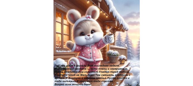 Теги:год уже идёт к финалу, вот последняя неделя и сейчас пора настала вести планы к завершенью пусть нежданно куш солидный упадёт перед тобою, улететь чтоб на мальдивы, там смешать коктейли с кровью и фортуна в царском платье пусть войдёт к тебе вальяжно и закружит тебя счастье вихрей всех мощнее даже