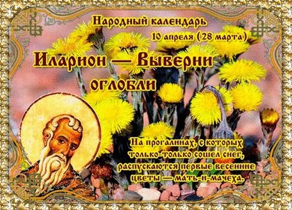 Народный календарь 10 апреля (28 марта) Иларион - Выверни оглобли. На прогалинах, с которых только-только сошел снег, распускаются первые весенние цветы - мать-и-мачеха.