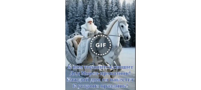 Анимированная открытка "К нам торопится, спешит Дед Мороз-проказник! Каждый дом он навестит и устроит праздник!"