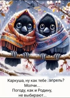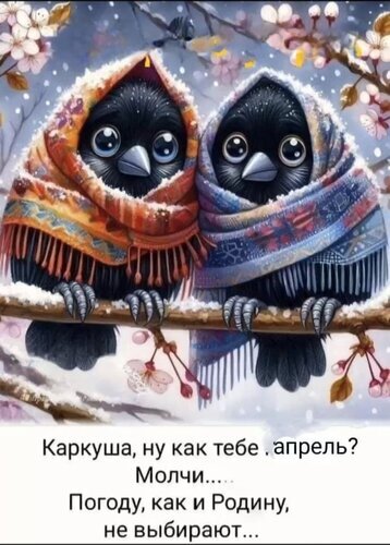 Милая и ироничная цифровая иллюстрация с двумя очаровательными черными птичками, укутанными в теплые узорчатые шали. Птицы сидят на заснеженной ветке среди цветущих деревьев, создавая контраст весеннего цветения и зимнего холода. В нижней части изображения размещена философская надпись на русском языке о том, что погоду и Родину не выбирают. Изображение наполнено уютом, легкой грустью и юмором, идеально подходит для использования в соцсетях, мемах и тематических подборках о весне и настроении.