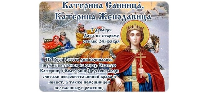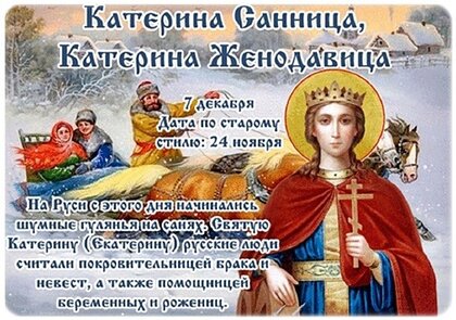 Катерина Санница, Катерина Женодавица. 7 декабря. Дата по старому стилю: 24 ноября. На Руси с этого дня начинались. шумные гулянья на санях. Святую Катерину (Екатерину) русские люди считали покровительницей брака и невест, а также помощницей беременных и рожениц.