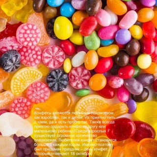 Теги:конфеты являются любимым лакомством, как взрослых, так и детей их приятно пить с чаем, да и есть просто так также всегда приятно подарить конфетку другу или маленькому ребенку среди взрослых существует огромное количество сладкоежек любителей конфет становится больше с каждым годом именно поэтому был придуман праздник день конфет, который отмечают 18 октября