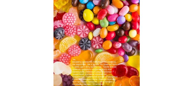 Теги:конфеты являются любимым лакомством, как взрослых, так и детей их приятно пить с чаем, да и есть просто так также всегда приятно подарить конфетку другу или маленькому ребенку среди взрослых существует огромное количество сладкоежек любителей конфет становится больше с каждым годом именно поэтому был придуман праздник день конфет, который отмечают 18 октября