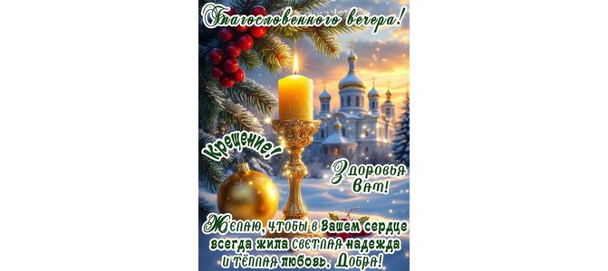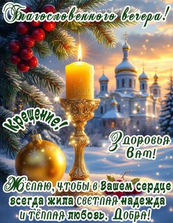 Благословенного вечера! Крещение. Здоровья вам! Желаю, чтобы в вашем сердце всегда жила светлая надежда и тёплая любовь. Добра!