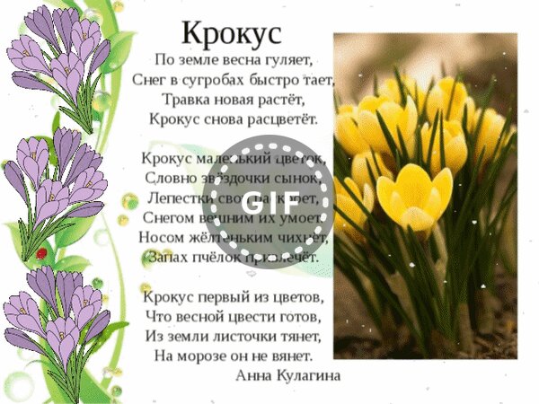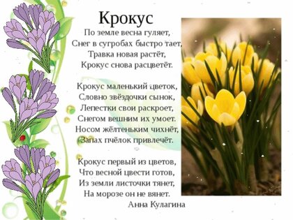 По земле весна гуляет, Снег в сугробах быстро тает, Травка новая растёт, Крокус снова расцветёт. Крокус маленький цветок, Словно звёздочки сынок, Лепестки свои раскроет, Снегом вешним их умоет. Носом жёлтеньким чихнёт, Запах пчёлок привлечёт. Крокус первый из цветов, Что весной цвести готов, Из земли листочки тянет, На морозе он не вянет. Анна Кулагина