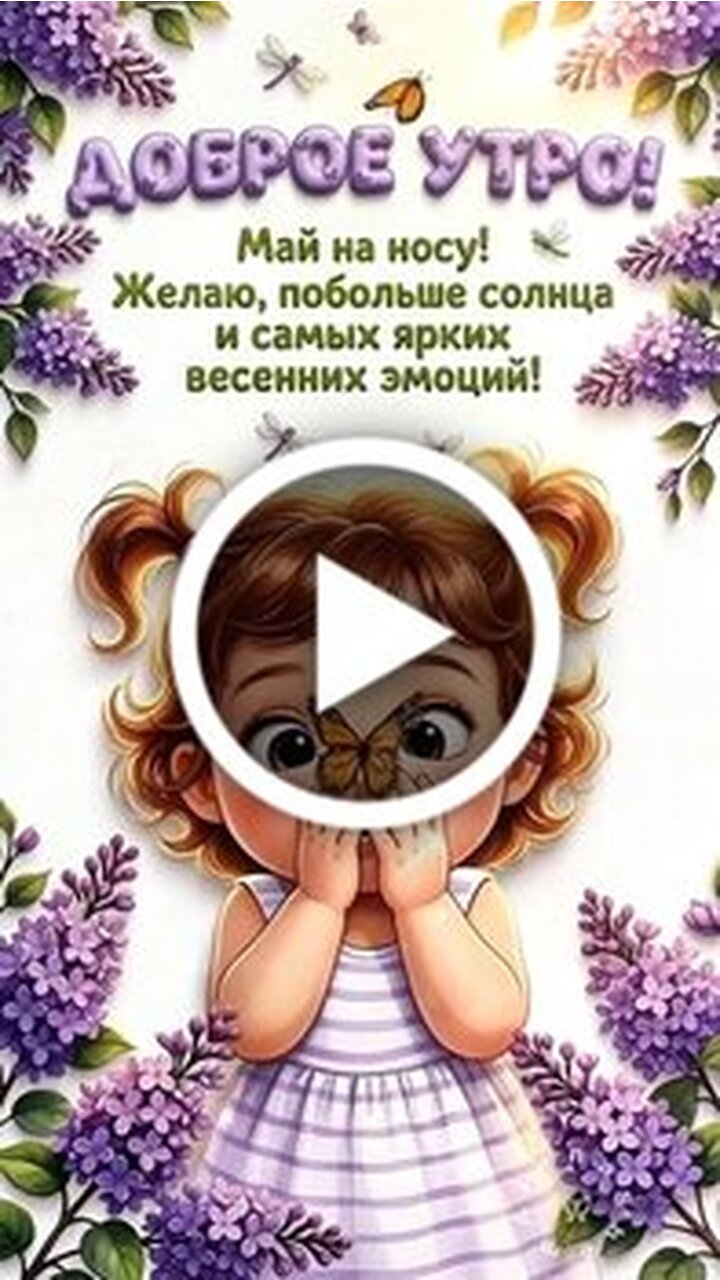 Красочное и позитивное видео с пожеланием доброго утра. На фоне цветущей сирени и ярких бабочек маленькая девочка переживает забавную и милую встречу с бабочкой, которая садится ей на нос. Видео наполнено весенним настроением, теплыми красками и искренними эмоциями. Это идеальный ролик, чтобы поднять настроение близким и пожелать им солнечного дня и самых ярких весенних впечатлений.
