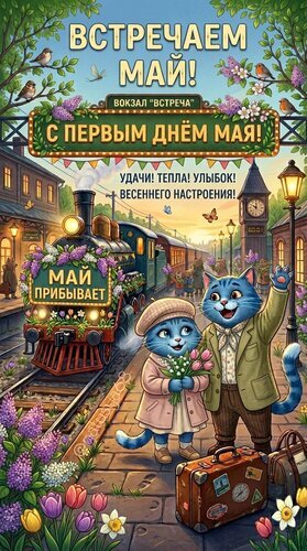 Яркая поздравительная иллюстрация к 1 Мая в весеннем стиле. На картинке изображены очаровательные антропоморфные коты на железнодорожном вокзале: кот в кепке с букетом тюльпанов и кот в пиджаке, приветствующий весну. На заднем плане виден ретро-поезд, цветы, птицы и солнечный пейзаж. Текст на русском языке: "Встречаем май!", "С первым днём мая!", "Май прибывает!". Иллюстрация наполнена радостью, теплом и праздничным весенним настроением, идеально подходит для открыток и тематических поздравлений.