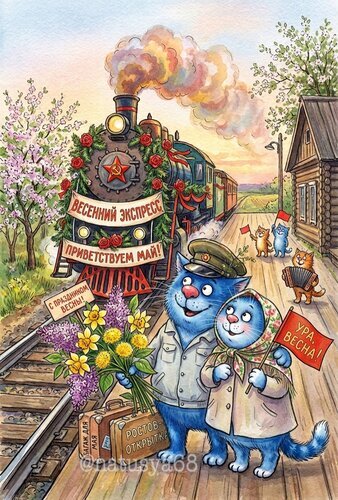 Иллюстрация в стиле ретро-открытки, изображающая очаровательную пару синих котов на железнодорожной платформе. На переднем плане — счастливый кот в форме и кошка в платке с букетом весенних цветов. Позади них стоит украшенный цветами и лентами старинный паровоз с надписью «Весенний экспресс, приветствуем май!». На фоне виднеются цветущие деревья, весеннее небо и другие коты с флажками. Атмосфера праздника, тепла и радостного ожидания весны. Идеально подходит для поздравительных открыток к маю и весеннему сезону.