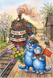 Иллюстрация в стиле детской книжной графики, изображающая празднование 1 Мая. На переднем плане — два очаровательных синих кота: взрослый и котенок, которые держат букет ярких весенних цветов (желтых и фиолетовых) и красный флажок с надписью «Встречаем Май!». На заднем плане величественно проезжает празднично украшенный паровоз с надписями на русском языке: «ПОЕЗД МАЯ» и «МИР! ТРУД! МАЙ!». Поезд декорирован красными розами и лентами, из трубы идет густой дым. Пейзаж наполнен весенним цветением садов и теплым солнечным светом, что создает атмосферу радости, праздника и ностальгии.