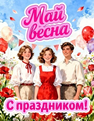 Красочная праздничная иллюстрация в весеннем стиле. На фоне голубого неба с облаками и летящими лепестками цветов изображены трое улыбающихся молодых людей: две девушки и юноша. Атмосфера праздника дополнена воздушными шарами, гирляндами и яркими цветами (маками и тюльпанами). В верхней части картинки крупная розовая надпись «Май весна», а внизу — поздравительная надпись «С праздником!». Идеально подходит для весенних открыток, поздравлений с праздниками мая и создания праздничного настроения.