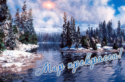 Зимний пейзаж и надпись на открытке "Мир прекрасен!"