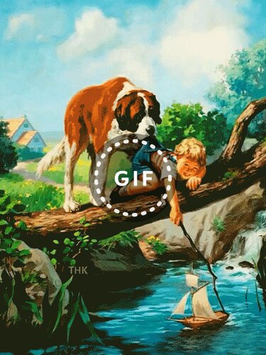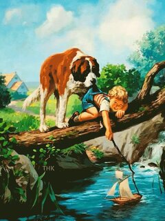 Живописная ретро-иллюстрация в классическом стиле, изображающая трогательную сцену на природе. На переднем плане крупный пятнистый пес (похожий на сенбернара) стоит на толстой ветви дерева, присматривая за маленьким мальчиком. Мальчик, одетый в синюю одежду, склонился над водой, запуская игрушечный парусник в небольшую реку. Пейзаж наполнен сочной зеленью, мягким солнечным светом и спокойной атмосферой. Картина передает чувство детской беззаботности, верности животных и умиротворения природы. Идеально подходит для декора в стиле ностальгии, винтажной иллюстрации или детской комнаты.
