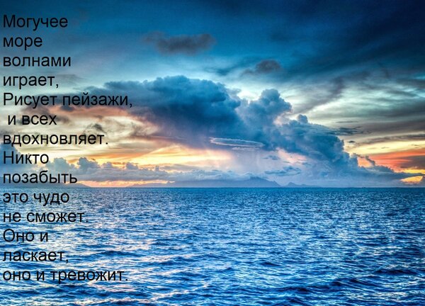 Теги:могучее море волнами играет, рисует пейзажи, всех, вдохновляет, никто, позабыть, это, чудо, сможет, оно, ласкает, оно и тревожит