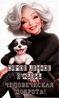 Иллюстрация с вдохновляющей цитатой на русском языке: «Самое ценное в жизни — человеческая доброта!». На изображении представлена элегантная улыбающаяся женщина с пышной седой прической в черной водолазке, которая нежно обнимает маленькую черно-белую собаку. Теплая, позитивная и эмоциональная картинка, идеально подходящая для социальных сетей, открыток с пожеланиями добра, статусов о жизни и мотивационных постов о доброте и любви к животным.