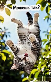 Смешная картинка-мем с полосатым котенком, который забавно закинул лапки вверх и перевернулся на спину. На изображении виден пушистый живот кота и его удивленное выражение мордочки. Фон — сочная зеленая листва деревьев под ярким солнечным светом. В верхней части картинки расположен текст на русском языке: «Можешь так?». Идеально подходит для публикации в соцсетях, использования в качестве забавного стикера или мема для поднятия настроения.