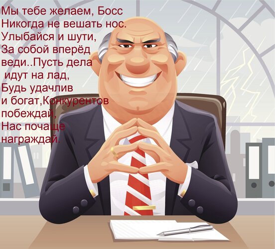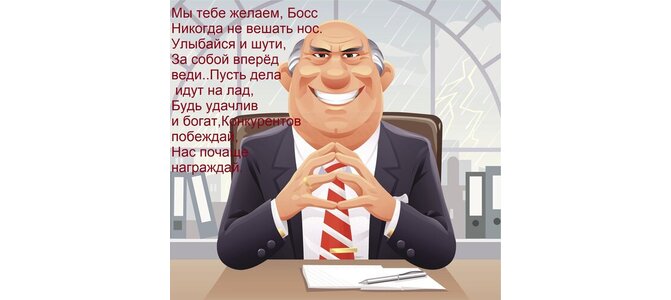 Открытка "Мы тебе желаем, Босс Никогда не вешать нос. Улыбайся и шути, За собой вперёд веди.. Пусть дела идут"