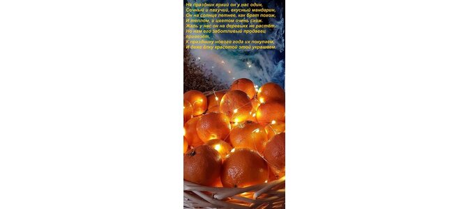 Теги:на праздник яркий он у нас один, сочный и пахучий, вкусный мандарин, он на солнце летнее, как брат похож, и теплом, и цветом очень схож жаль у нас он на деревьях не растёт, но нам его заботливый продавец привезёт, к празднику нового года их покупаем, и даже ёлку красотой этой украшаем