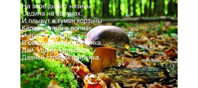 Теги:на заре дымят низины, седина на валунах и плывут в туман корзины каравеллами в волнах и хочу я удалиться в светлый мир березняка дай, удача, утолиться давней страсти грибника