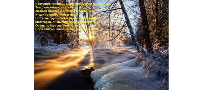 Теги:наступил ноябрь с ним, наступило понимание, того, что тепло осталось позади желтой листвы с деревьев послание, как-то особо ноет в груди но ты не грусти, тебе мое поздравление, моя тоска, лишь мимолетное мгновение, осень прекрасна в печали своей, пора стихов, любви и осенних страстей