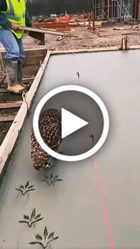 Строители залили фундамент, разровняли егп, а сова прошла по сырому цементу и оставила следы лап.