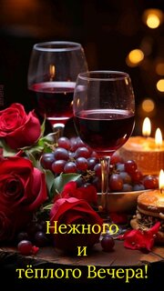 Нат столике стоять два бокала с вином, ваза с виноградом, горящие свечи и алые розы