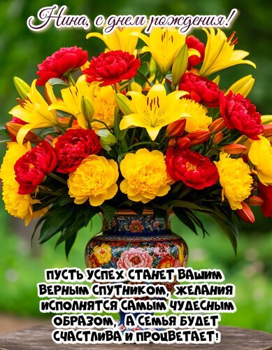 Красивая поздравительная открытка к дню рождения для Нины. На изображении представлен пышный и яркий букет из красных пионов и желтых лилий в изысканной расписной вазе. В верхней части кадра каллиграфическая надпись «Нина, с днем рождения!», а в нижней — теплое пожелание на русском языке: о достижении успехов, исполнении заветных желаний и семейном процветании. Идеально подходит для отправки в мессенджерах и социальных сетях как цифровое поздравление.