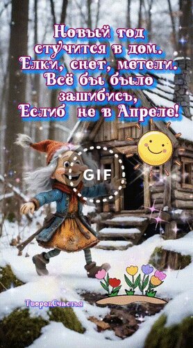 Анимированная открытка "Новый год стучится в дом - елки, снег, метели. Всё бы было зашибись, если б не в апреле!"