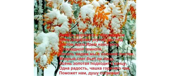 Теги:ноябрь ворвался к нам первым днем, шарфами укутал, мы под зонтом идем, идем навстречу прохладной темноте, печаль, видим, осенней, листве, мокрый, снег, бьет, лицу, осень золотая подходит к концу