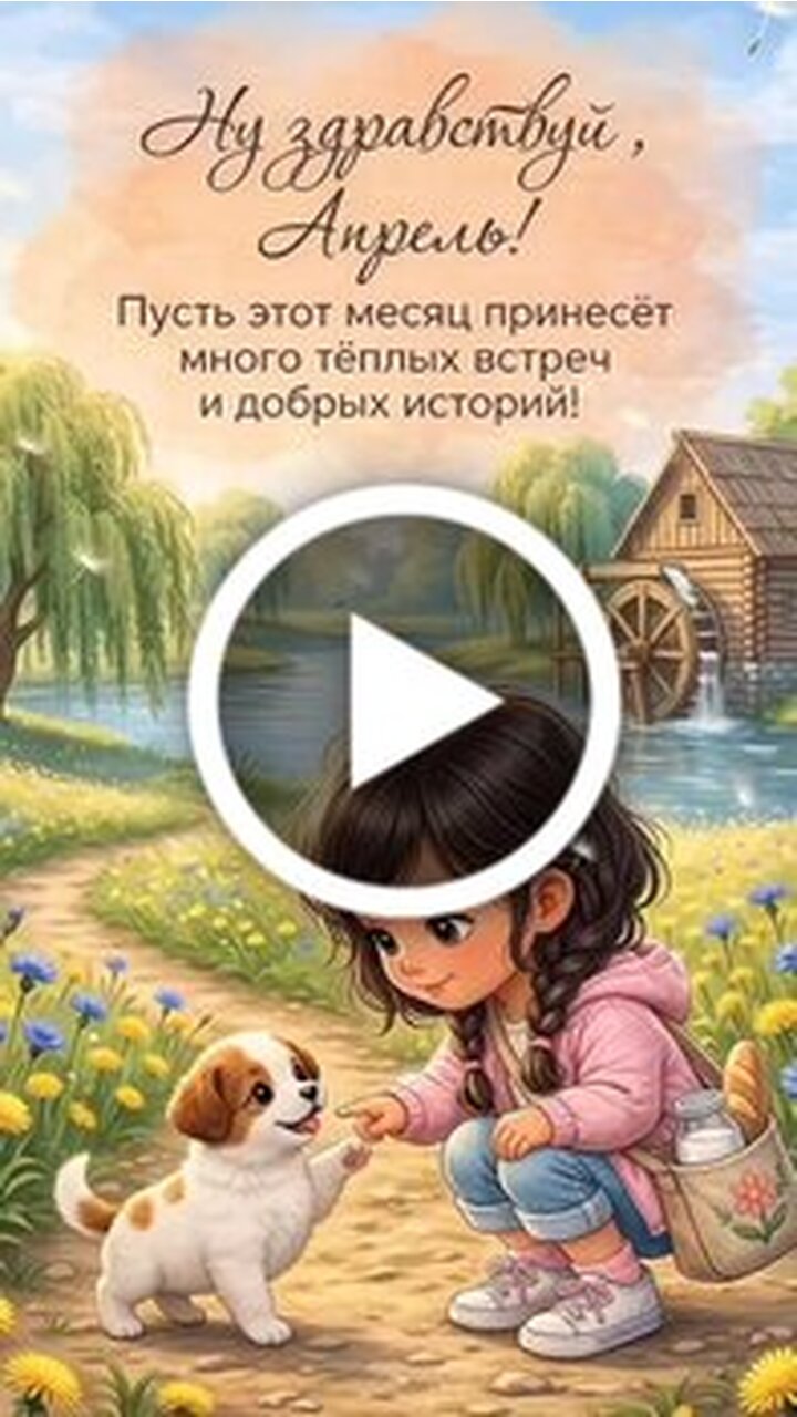 Красивая и добрая иллюстрация, посвященная началу апреля. На видео изображена милая девочка с косичками, которая сидит на лесной тропинке рядом с рекой и играет с маленьким белым щенком. На фоне видны деревья, полевые цветы и старинная водяная мельница. Текст на изображении приветствует апрель и желает, чтобы этот месяц принес много теплых встреч и добрых историй. Видео наполнено атмосферой весеннего уюта, радости и надежды на новые прекрасные моменты.