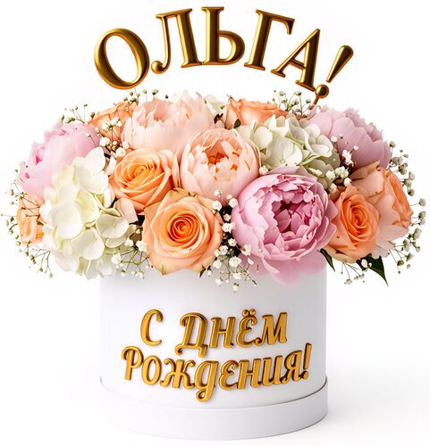 Роскошный праздничный букет в белой шляпной коробке, идеально подходящий для поздравления женщины по имени Ольга. Композиция состоит из нежных розовых и персиковых пионов, классических роз различных оттенков и пышных белых гортензий, дополненных мелкими соцветиями гипсофилы. На коробке и над букетом расположены золотые объемные надписи: «ОЛЬГА!» и «С ДНЕМ РОЖДЕНИЯ!». Элегантный и премиальный подарок, который подчеркнет торжественность момента и создаст незабываемое настроение.