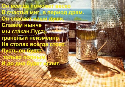 Теги:он всегда поможет веско в счастья миг, в период драм он спасает наши души, славим, нынче, стакан, пусть, граненый, неизменно, столах, всегда, стоит, будет, только