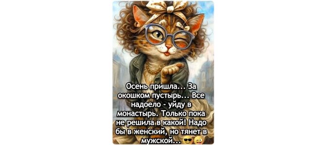 Осень пришла... За окошком пустырь... Все надоело - уйду в монастырь. Только пока не решила в какой! Надо бы в женский, но тянет в мужской...