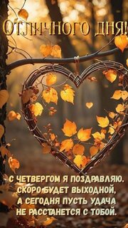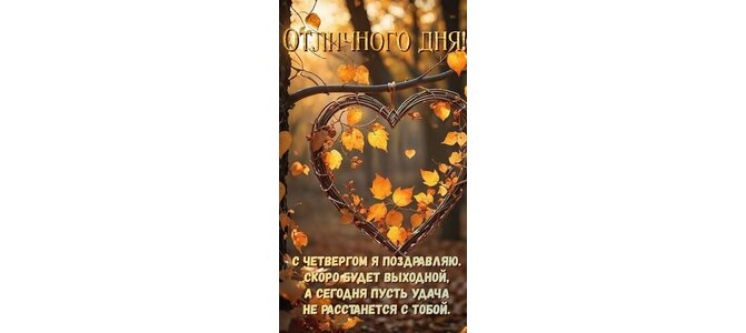 Открытка "Отличного дня!С четвергом я поздравляю. Скоро будет выходной, А сегодня пусть удача Не расстанется с"