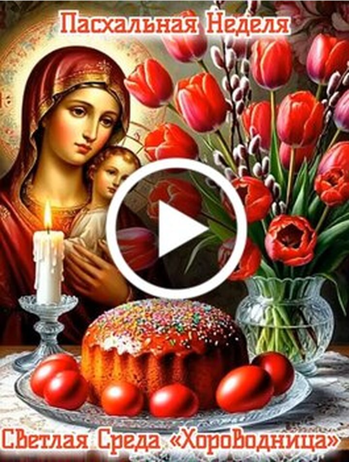 Это праздничное видео посвящено Светлой седмице и Пасхальной неделе. В центре композиции находится икона Богородицы с младенцем Христом, которая символизирует духовную радость и благословение. Видео наполнено пасхальной символикой: на переднем плане изображен традиционный праздничный кулич, украшенный яркими красными пасхальными яйцами, а рядом стоит зажженная свеча, олицетворяющая свет веры. Композицию дополняет пышный букет из красных тюльпанов, создающий атмосферу весны и торжества. Видео сопровождается надписями Пасхальная неделя и Светлая Среда Хороводница, что делает его идеальным для поздравлений в светлые праздничные дни.