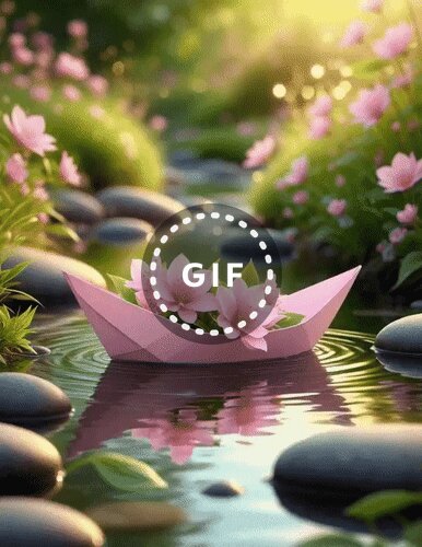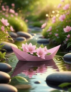 Живописная и умиротворяющая цифровая иллюстрация, изображающая розовую бумажную лодочку оригами, плавающую на спокойной глади воды в цветущем саду. Внутри лодочки находятся нежные розовые цветы, которые отражаются в воде. Вокруг лодки разбросаны гладкие темные камни, а на заднем плане видна размытая зелень и яркие розовые цветы под мягким солнечным светом. Изображение передает атмосферу спокойствия, медитации и весенней эстетики.