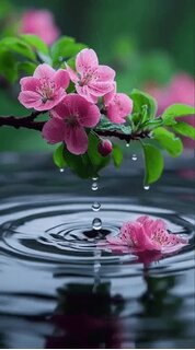Красивое макрофотография розовых цветов (вероятно, вишни или яблони), расцветающих после дождя. На переднем плане запечатлен момент падения капли воды в темную зеркальную гладь, создающей изящные концентрические круги на поверхности. Нежные лепестки покрыты мелкими каплями росы, а мягкий размытый фон (боке) подчеркивает свежесть и эстетику весенней природы. Идеально подходит для использования в качестве обоев, иллюстраций к темам природы, весеннего обновления и спокойствия.