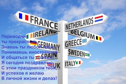 Открытка "Переводчик ты прекрасный, знаешь ты любой язык, понимаешь иностранцев и общаться ты привык! "