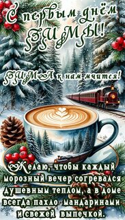 С первым днем зимы! Желаю, чтобы каждый морозный вечер согревался душевным теплом, а в доме всегда пахло мандаринами и свежей выпечкой.