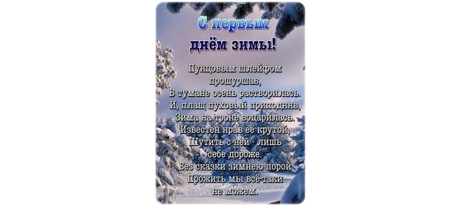 С первым днём зимы! Пунцовым шлейфом прошуршав, в тумане осень растворилась. И, плащ пуховый приподняв, Зима на троне воцарилась. Известен нрав её крутой, шутить с ней - лишь себе дороже. Без сказки зимнею порой прожить мы всё-таки не можем.