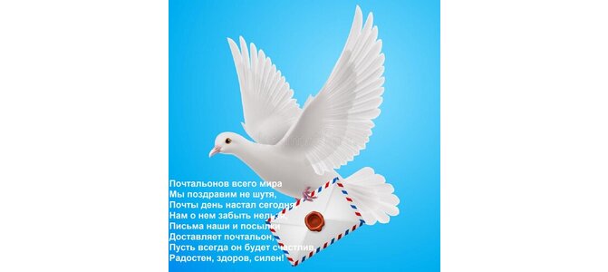 Теги:почтальонов всего мира мы поздравим не шутя, почты день настал сегодня, нам о нем забыть нельзя, письма наши и посылки доставляет почтальон, пусть всегда он будет счастлив, радостен, здоров, силен