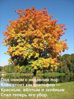 Открытка "Под окном с недавних пор Клён стоит как светофор — Красным, жёлтым и зелёным Стал теперь его убор."