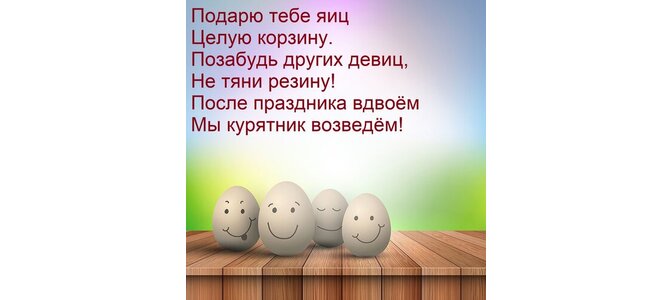 Теги:подарю тебе яиц целую корзину позабудь других девиц, не тяни резину после праздника вдвоём мы курятник возведём