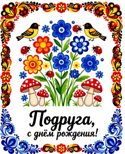 Яркая поздравительная открытка в стиле народной росписи (хохлома/жаров-птица) с надписью «Подруга, с днём рождения!». Композиция включает красочный букет синих и красных цветов, маленьких птичек, божьих коровок и мухоморов. Декор дополнен орнаментальной рамкой из золотистых, красных и синих узоров на белом фоне. Идеально подходит для цифрового поздравления близкой подруги.