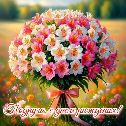 Красивая поздравительная открытка с пышным букетом ярких альстромерий в розовых и белых тонах. Цветы перевязаны нежной атласной лентой и расположены на фоне залитого солнцем летнего луга. В нижней части изображения расположена элегантная надпись на русском языке: «Подруга, с днем рождения!». Идеально подходит для отправки в мессенджерах и социальных сетях в качестве теплого и эстетичного поздравления близкой подруге.