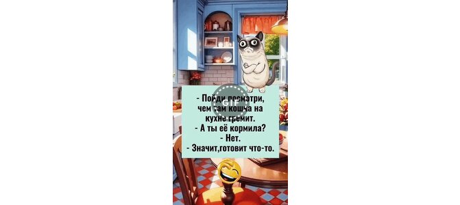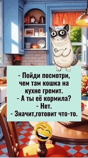 - Пойди посмотри, чем там кошка на кухне гремит. - А ты её кормила? - Нет. - Значит, готовит что-то.
