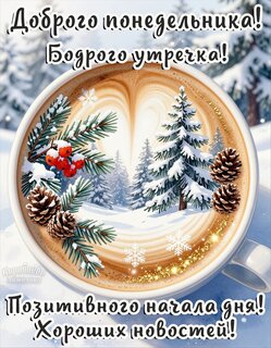 Теги:понедельник, дни недели, доброе утро, позитив, кофе, ель, чашка кофе, красивая картинка, удачи, добра, зима, снег
